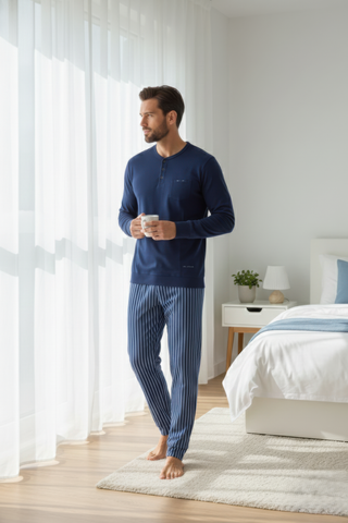 La collezione uomo interpreta il nightwear come uno spazio personale di autenticità: essenziale nelle linee, curata nelle costruzioni, naturale nei materiali.